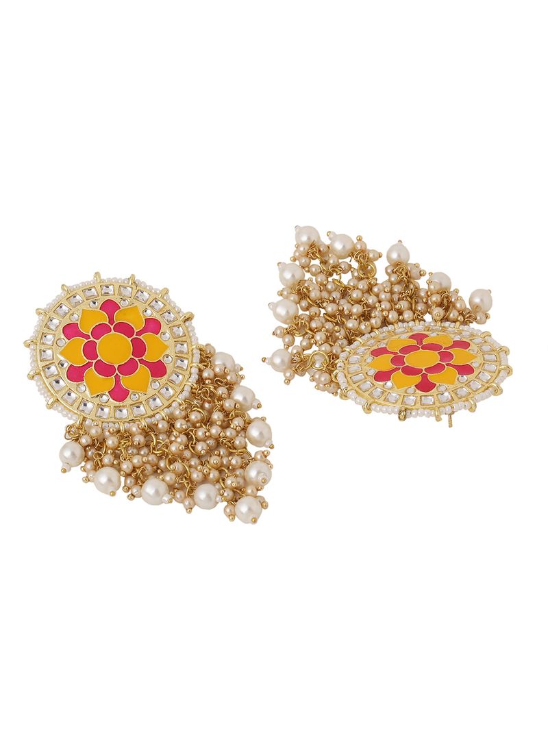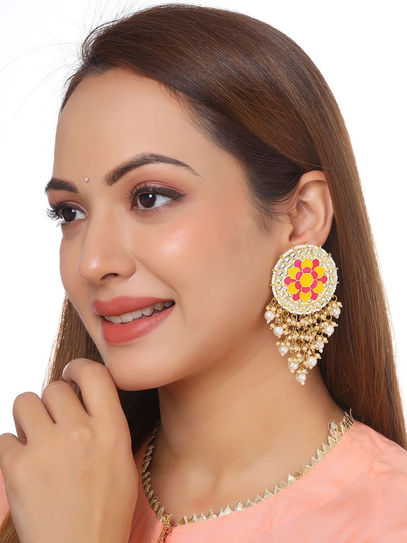 House Of Ree Flower Pattern Yellow and Pink Meenakari Drop Earrings for Womens | Women | Girls ER111