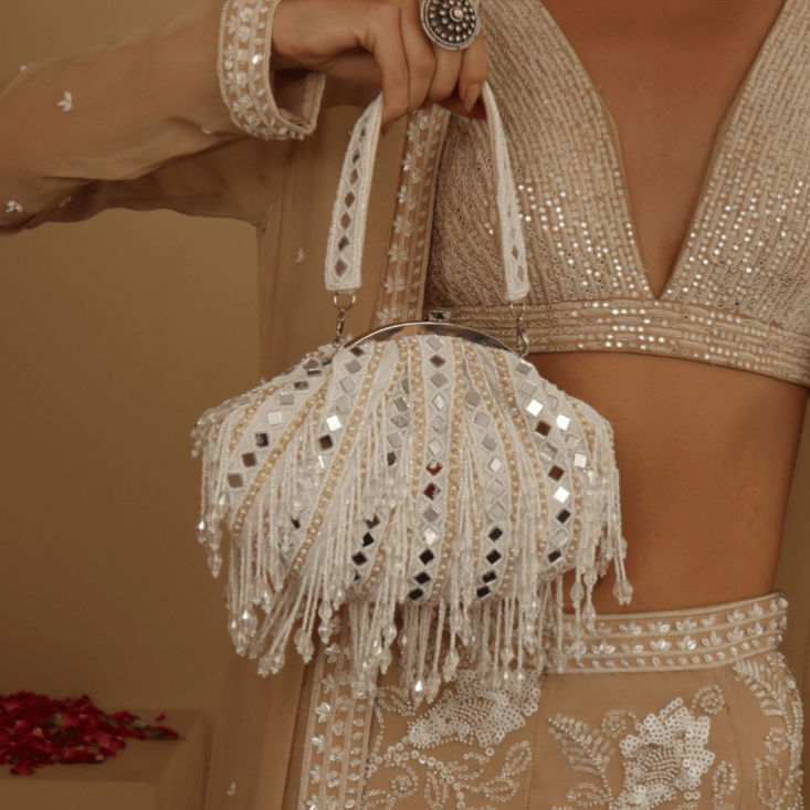 House Of Ree New Stylish Partywear White Mirror Work Potli Bag for Womens | Women | Girls SBG002